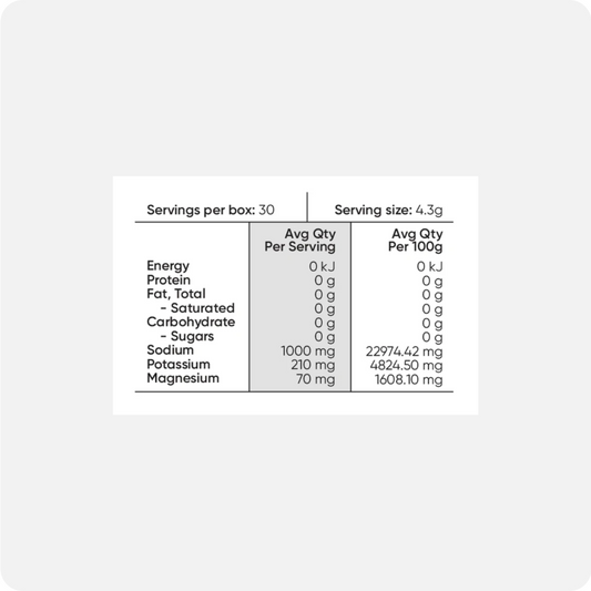 Sodii Unflavoured Hydration Salts (30 Sachets) Purposeful Hydration. Clean Ingredients. Ultimate Convenience. Stay hydrated and energised with a clean, powerful blend of essential electrolytes designed to support your body where it needs it most. Carefully formulated with natural Australian lake salt, magnesium, and potassium, Sodii helps replenish the essential electrolytes your body loses through sweat and daily activity. Why Electrolytes Matter SodiumPlays a critical role in fluid balance, blood pressure regulation, and muscle contraction. Without enough sodium, your body struggles to retain water, leading to dehydration, fatigue, and dizziness - especially during exercise or hot weather. PotassiumWorks alongside sodium to maintain fluid balance, support proper nerve signals, and regulate heartbeat. Low potassium can contribute to muscle weakness, cramping, and irregular heart rhythms. MagnesiumSupports over 300 biochemical reactions in the body. It’s essential for energy production, muscle function, nerve signalling, and preventing cramps. Magnesium also supports calmness, sleep quality, and muscle recovery after physical exertion. Key Benefits: Convenient single-serve sachets - perfect for travel, gym bags, or your workday Replenishes electrolytes lost through sweat, stress, or dehydration Supports muscle function, reduces cramping, and aids post-exercise recovery Promotes energy, focus, and mental clarity throughout the day Clean ingredients, no artificial sweeteners or sugars and flavoursRegular price AUD$64.90Sale price AUD$64.90 Regular priceUnit price per -