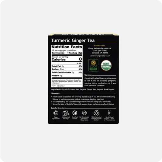 BUDDHA TEAS Organic Herbal Tea Bags – Turmeric Ginger Tea Experience the warming, soothing blend of turmeric and ginger with Buddha Teas Organic Turmeric Ginger Tea. Crafted from high-quality, organic ingredients, this herbal tea supports overall wellness and can be a comforting addition to your daily routine. Turmeric and ginger have long been valued for their natural properties. Turmeric contains curcumin, known for its antioxidant and anti-inflammatory benefits, while ginger may support digestion and help maintain a healthy inflammatory response. Together, they create a naturally warming and flavourful infusion. Each tea bag is carefully portioned for convenience, making it easy to brew a cup of soothing tea at home or on the go. Key Benefits:• Made with organic turmeric and ginger• Naturally caffeine-free and wont break a fast• Supports digestion and overall wellness• Antioxidant-rich herbal blend• Convenient, individually wrapped tea bagsRegular price AUD$13.95Sale price AUD$13.95 Regular priceUnit price per -