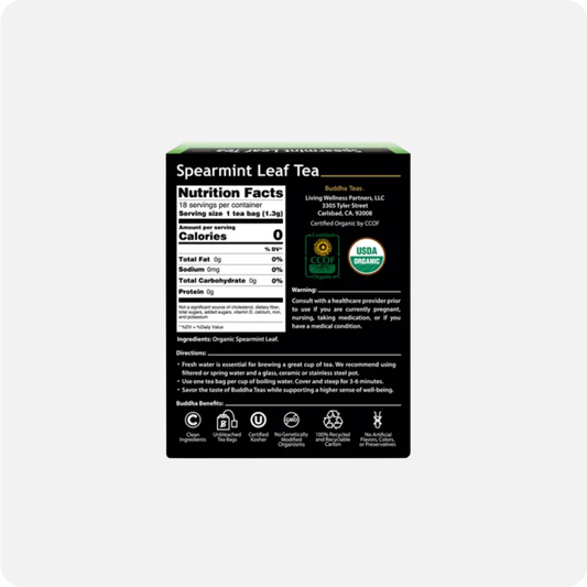 Buddha Teas Organic Herbal Tea Bags – Spearmint Leaf (18 Pack) Buddha Teas Organic Spearmint Leaf Tea is made from 100% organic spearmint leaves and contains no artificial ingredients or additives. Naturally caffeine-free, this herbal tea has a clean, refreshing taste and can be enjoyed at any time of day. Spearmint is traditionally used to support digestion, reduce bloating, and promote a sense of calm making it a useful addition to your daily routine. Each box contains 18 individually wrapped tea bags for convenience and freshness. Key Features: Pure, organic spearmint leaves Caffeine-free May support digestion and relaxation 18 individually wrapped tea bags No artificial flavours, additives, or fillersRegular price AUD$13.95Sale price AUD$13.95 Regular priceUnit price per